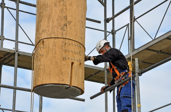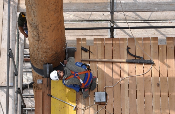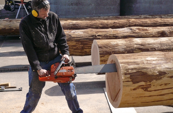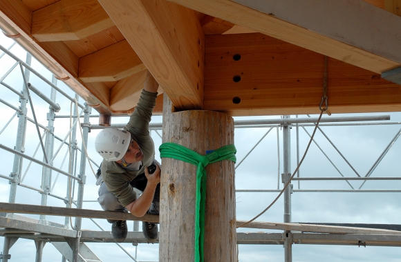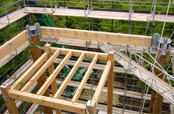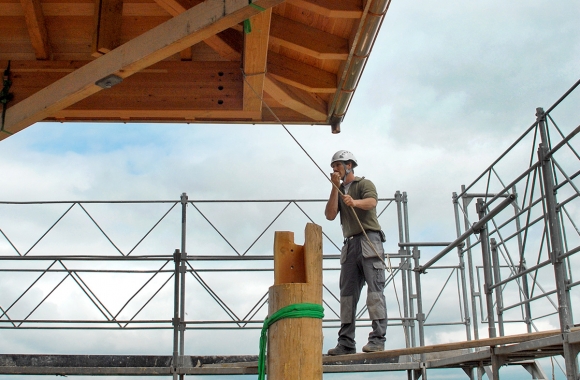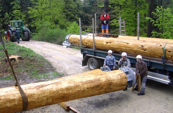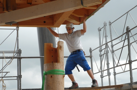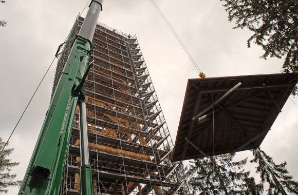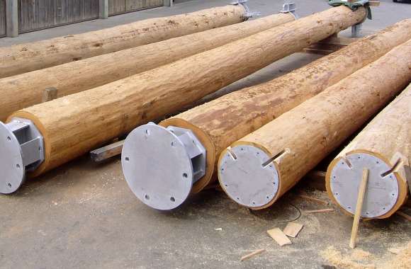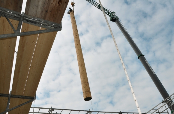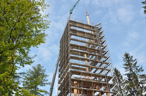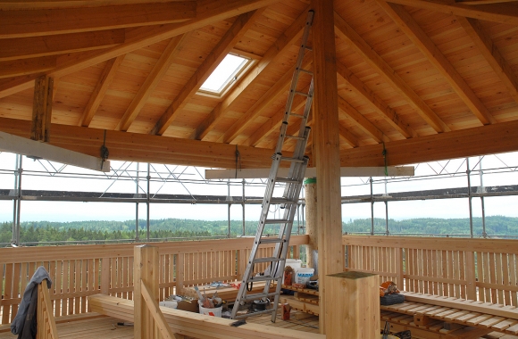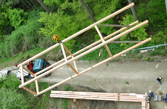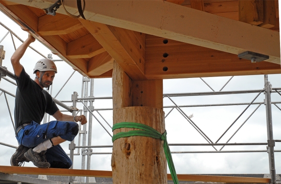 | Unsere Arbeiten | Bearbeitung von Rundholzstützen, Logistik von Transport und Kranarbeit, Turm- und Dachkonstruktion |