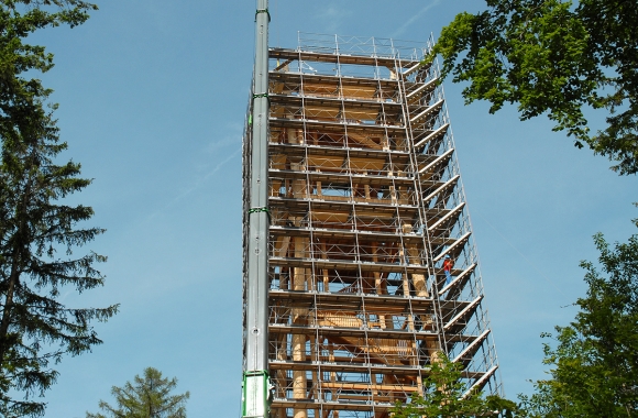 Die Arbeiten in Höhen bis zu 45 Metern stellten spezielle Anforderungen an die Mitarbeiter: dazu gehörte auch eine gut vorbereitete Arbeitssicherheit inklusive Training mit der Kletterausrüstung. Die engen Platzverhältnisse im Frienisbergerwald und die vorgefertigten Bauteile von bis zu 7 Tonnen Gewicht erforderten eine genaue Logistik von Transport und Kranarbeit um mit dem Turmbau möglichst effizient voran zu kommen.